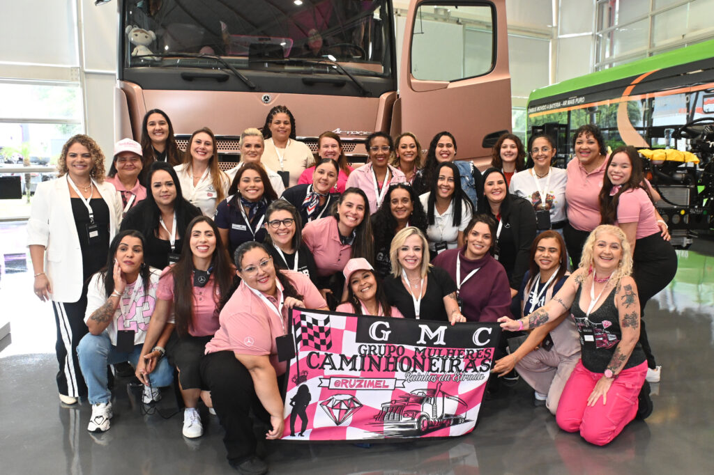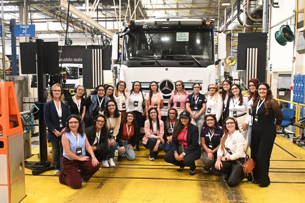 Na sequência, as participantes receberam orientações de segurança e seguiram para visita à linha de produção. Acompanharam de perto a montagem de caminhões e ônibus, entendendo cada etapa do processo e se conectando ainda mais com o universo em que atuam diariamente.